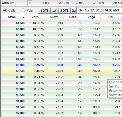 AUDJPY vols of 3m tenors are also at the decent side which is conducive for option holders, while skews have positively stretched on OTM put with attractive gammas, this Options Greek is the rate of change of the Delta with respect to the movement of the rate in the underlying market.