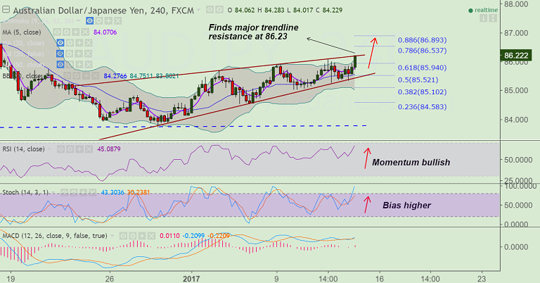 - On the upside we see major trendline resistance at 86.23, AUD/JPY has at the time of writing breached 86.23 and is currently trading at 86.26.