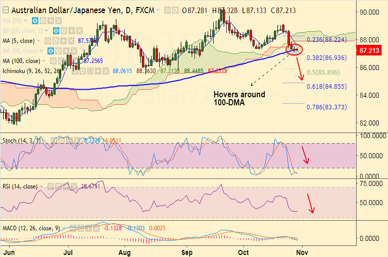 - AUD/JPY struggles to extend break below 100-DMA at 87.25, bias lower.