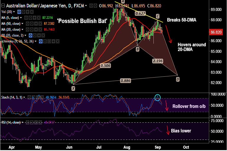 - Price action hovers around major support at 20-DMA at 86.74. Break below will see drag till 86.15 (rising trendline).