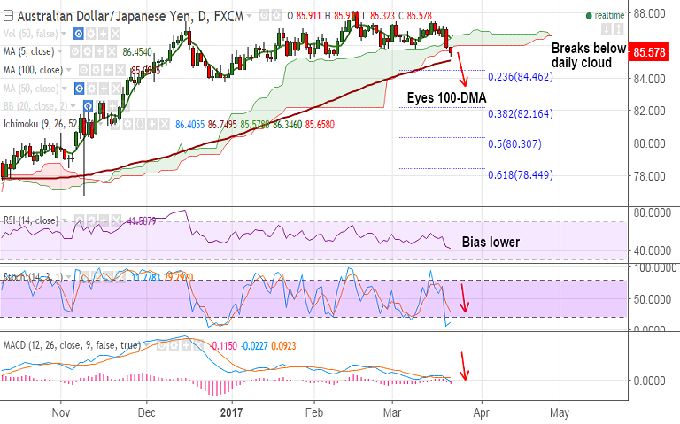 - AUD/JPY price action has dipped below daily cloud and is on track to test 100-DMA at 85.
