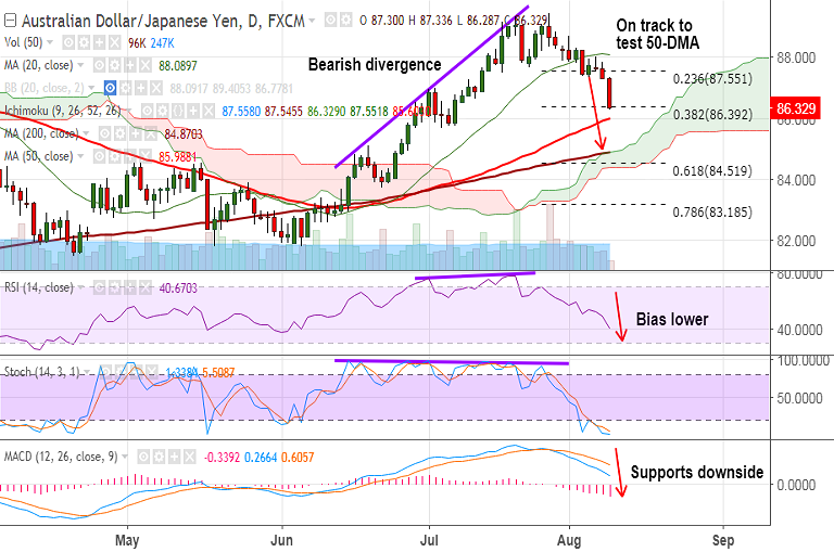 - AUD/JPY is hovering around 38.2% Fib at 86.39, bias lower.