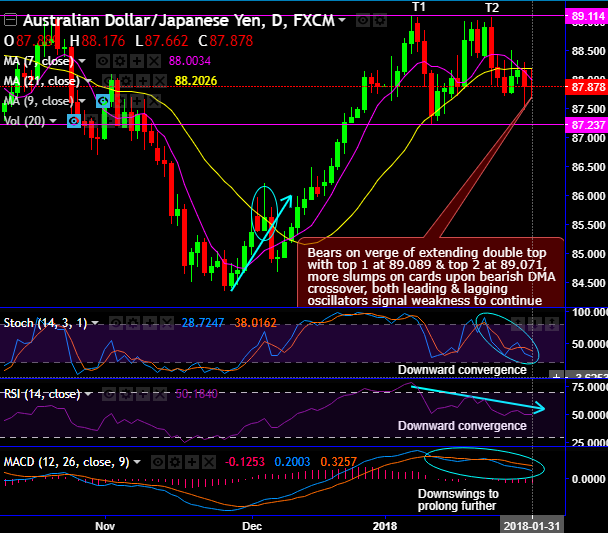Bears on verge of extending double top with top 1 at 89.089 & top 2 at 89.071, as a result, current prices are sliding below DMAs.