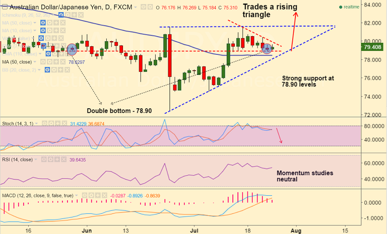 - AUD/JPY recovers from session lows at 79.06, the pair finds strong support at 78.90 (Double bottom - May 27, July 22). Weakness only on break below.