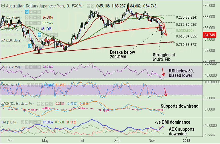 - The major is extending grind after break below 200-DMA which is currently major resistance at 85.96 levels.