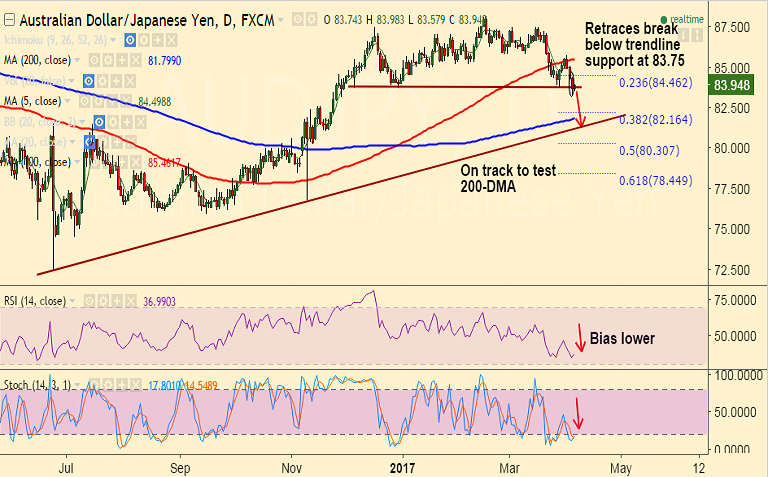 Call update: We had advised a short in our previous call (http://www.econotimes.com/FxWirePro-AUD-JPY-breaks-major-trendline-support-at-8375-eyes-200-DMA-stay-short-625055).