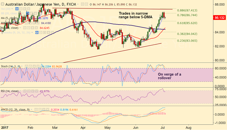 Resistance levels - 86.32 (5-DMA), 86.74 (78.6% Fib), 87
