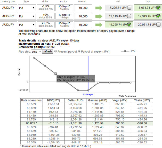So by buying another put at a lower strike in conjunction with bull put spread constitutes this position, the position assumes uncapped reward potential if AUDJPY plummets.