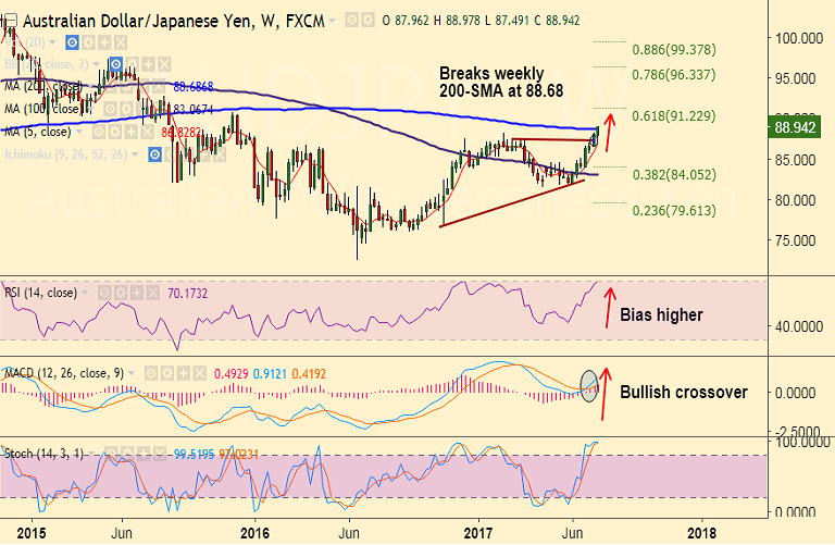 - AUD/JPY soars 1.26 pct on the day, spikes past weekly 200-SMA to hit 19-month highs at 88.94.