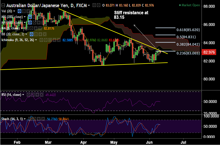 - AUD/JPY trades a narrow range, the pair is struggling to take out major trendline resistance at 83.15.
