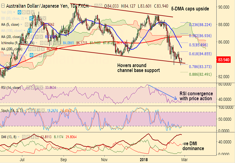 - AUD/JPY rejected at session lows at 83.60, hovers around 5-DMA at 84.02.