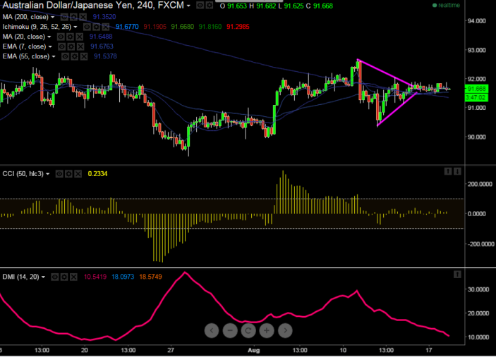 AUD/JPY is trading in narrow range 91.46-91.89 in the past two trading session. Short term trend is bullish as long as support 91 holds.