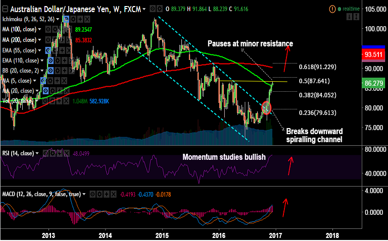 - AUD/JPY has broken a downward spiralling channel with rising volumes and edged higher.