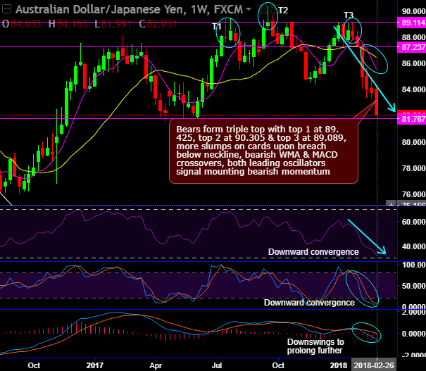 For now, more slumps seem to be on cards upon breach below the neckline, bearish WMA & MACD crossovers, while both leading oscillators signal mounting bearish momentum.