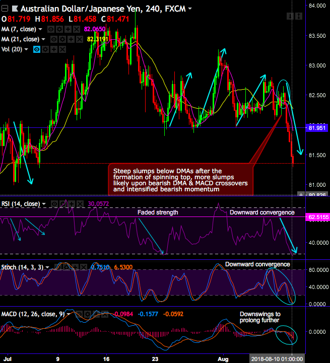 You can, now, observe AUDJPY’ssteep slumps below DMAs after the formation of spinning top pattern, for now,more slumps seem to be likely upon bearish DMA and MACD crossovers and intensified bearish momentum as both RSI and stochastic curves show downward convergence to the prevailing slumps (refer daily chart).