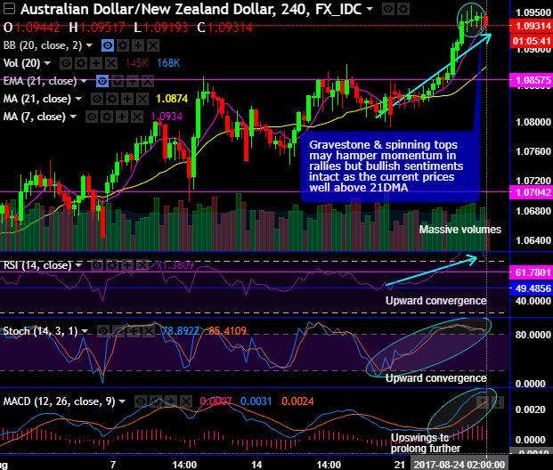 AUDNZD rallies seem to have been exhausted today as these bearish pattern candles may hamper momentum in rallies but bullish sentiments still remain intact as the current prices well above 21DMA.