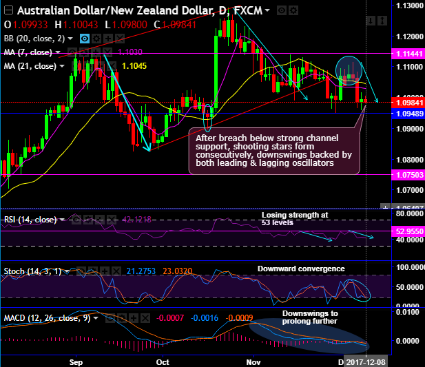 Ever since the channel support was breached, we’ve seen more bearish interests than the buying interests. Shooting stars occur at 1.1074 and 1.1062 levels consecutively (refer daily plotting), the downswings are backed by both leading & lagging oscillators on this timeframe.