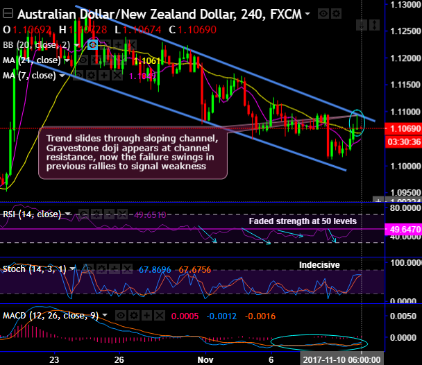 Gravestone Doji appears exactly at channel resistance (at 1.1069 levels), the failure swings at peaks of previous rallies rejected at channel resistance signal weakness (refer highs of previous trading session candle, 4H chart).