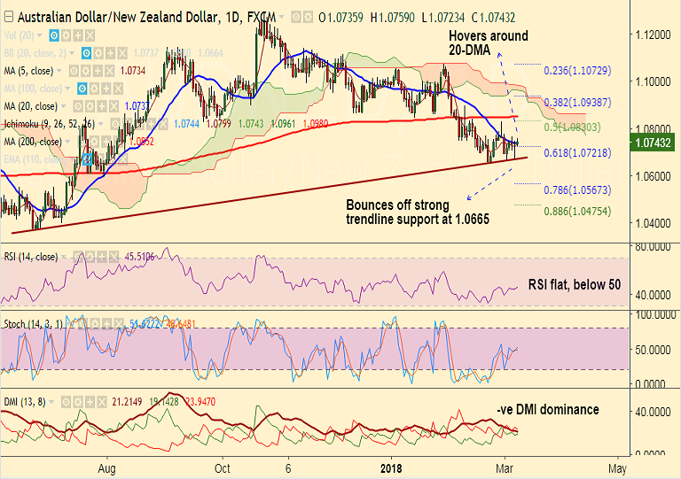 Support levels - 1.0734 (5-DMA), 1.0665 (trendline), 1.0654 (Feb 22 low), 1.0630 (channel base), 1.06