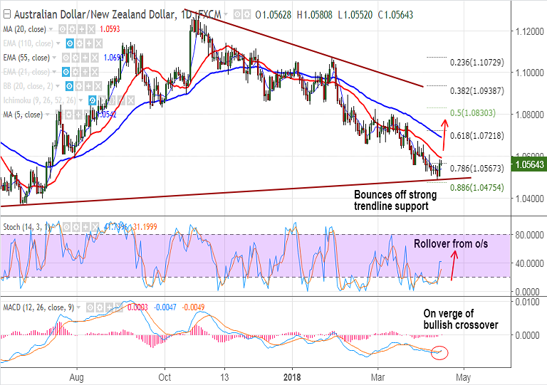 - AUD/NZD has bounced off strong trendline support at 1.0485, we see further weakness only on break below.