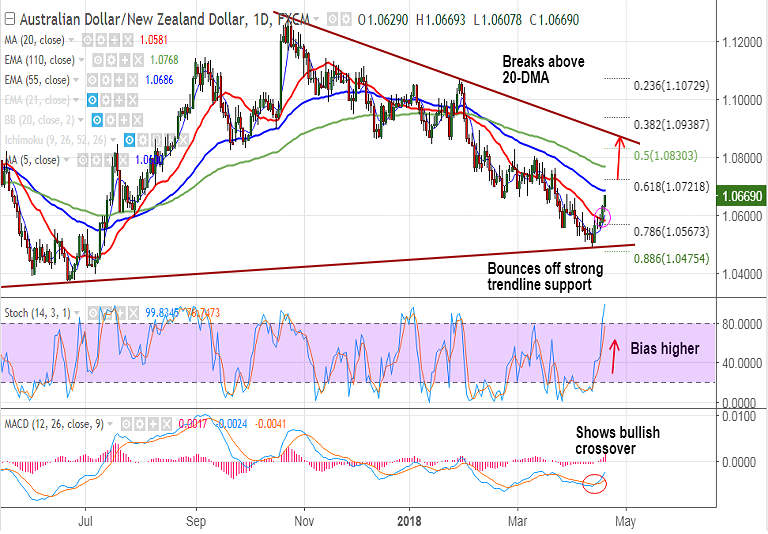 - AUD/NZD breaks above 20-DMA, raises scope for further upside.