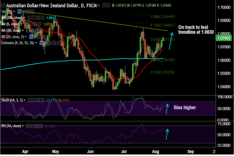 Call update: Our previous long call (http://www.econotimes.com/FxWirePro-AUD-NZD-breaks-100-DMA-at-10671-eyes-trendline-at-10830-stay-long-833838) has hit TP1.