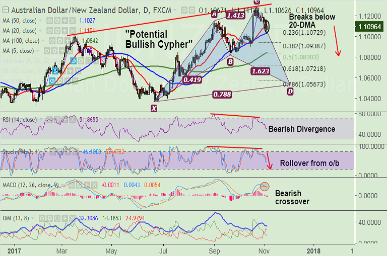 - AUD/NZD closes below 20-DMA support on Friday's trade, hits fresh 2-week lows at 1.1048, bias lower.