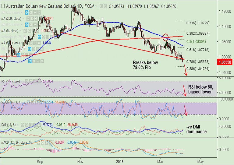 - AUD/NZD has breached below 78.6% Fib retracement of 1.03706 to 1.12899 rally at 1.05673.
