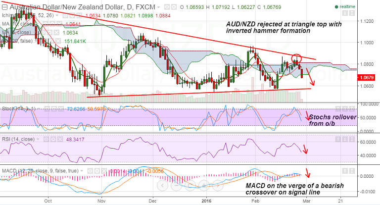 AUD/NZD extends downside after rejection at triangle top at 1.0874 in Wednesday's trade.