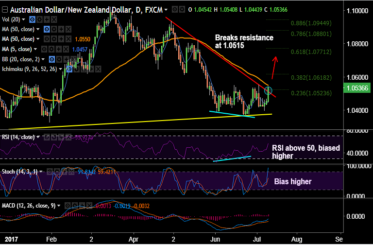 - AUD/NZD up 0.81% on the day, spike past key trendline resistance at 1.0515.