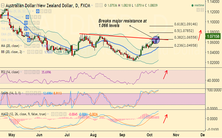 - AUD/NZD has broken major resistance at 1.066 levels (38.2% Fib, major trendline).