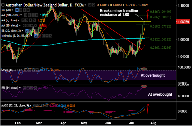 - AUD/NZD spiked past trendline resistance at 1.08 to hit fresh 2-month highs at 1.0845.