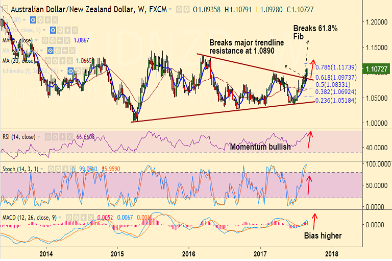 - AUD/NZD has shown a breakout of symmetric triangle pattern, scope for further upside.