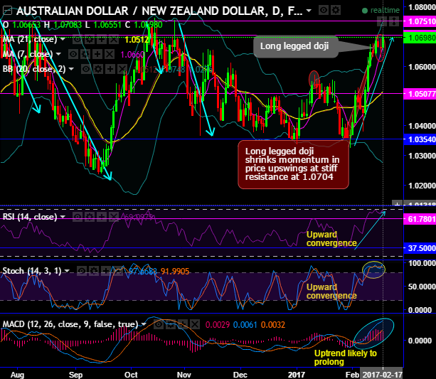 On the daily chart, despite the prevailing uptrend last three days bulls have been struggling to break resistance at 1.0705 levels, we see immediate resistances at 1.0705 and 1.0750 levels where the prices are restrained at that juncture and momentum in upswings likely to shrink away.