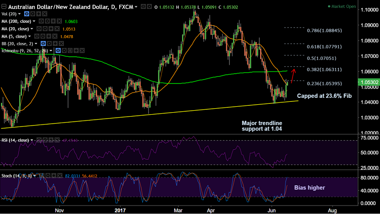 - AUD/NZD is on track to test 200-DMA at 1.06, bias remains higher, we recommend staying long in the pair.