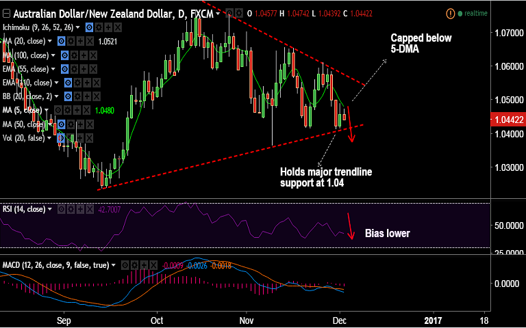- AUD/NZD has held major trendline support at 1.0415 and edged higher.