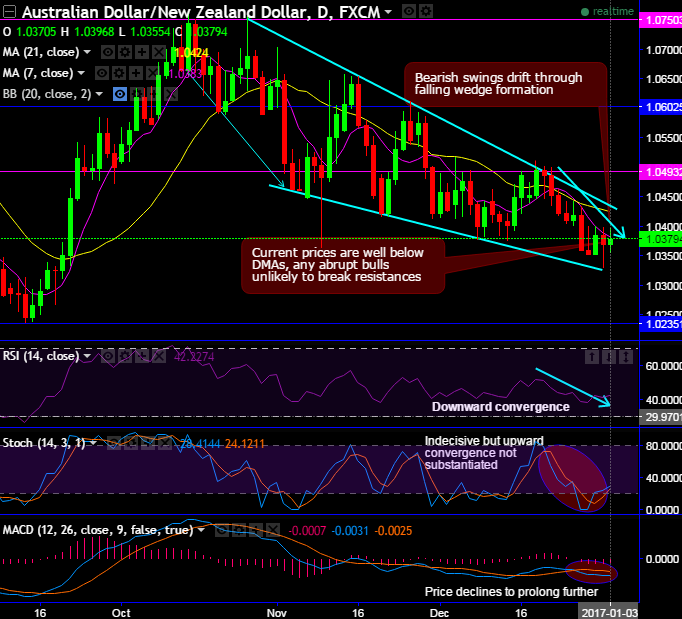 On the daily chart, despite last three-four days bulls taking support at 1.0350 levels and attempting to bounce, the prices are restrained below 7DMA.