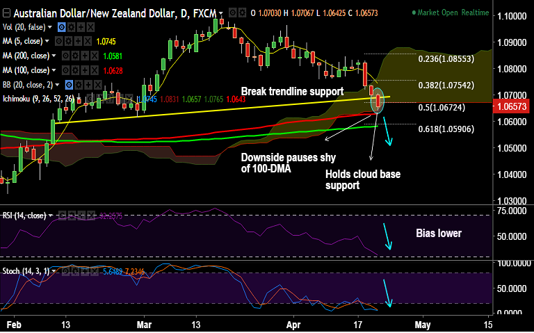 - AUD/NZD breaks major trendline support at 1.6890, price action is holding cloud base support at 1.0643.