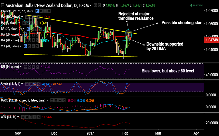 - AUD/NZD was rejected at major trendline resistance at 1.0530 on Friday's trade.