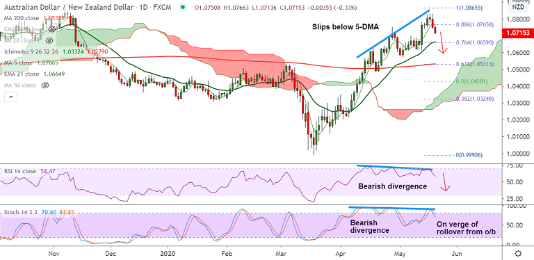 21-EMA is likely to offer strong support. Further weakness only on break below. Retrace and close above 5-DMA negates bearish bias.