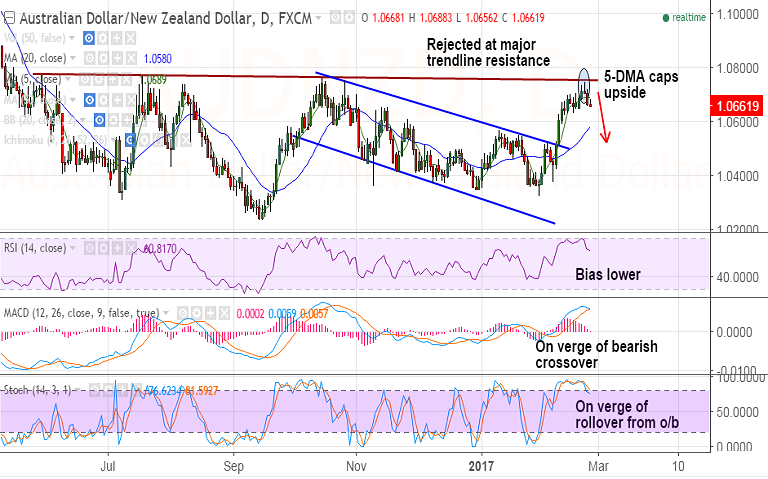 - The pair has closed below 5-DMA and recovery attempts on the day rejected below 5-DMA.