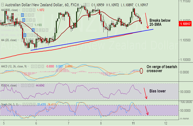 - The pair has broken below 20-SMA on the hourly charts and downside now finds major support at 1.1072 (converged trendline and 1H 200-SMA).