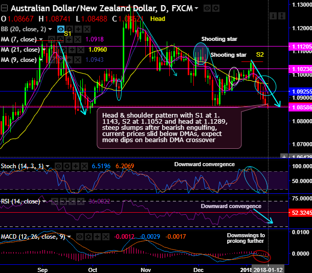 Steep slumps are witnessed soon after bearish engulfing, the current prices have slid below DMAs, expect more dips on bearish DMA crossover.