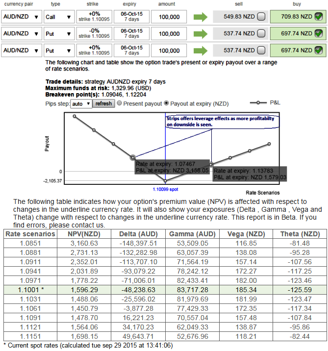 Huge profits achievable with the strip strategy when AUDNZD exchange rate makes a strong move either upwards or downwards at expiration, with greater gains to be made with a downward move.
