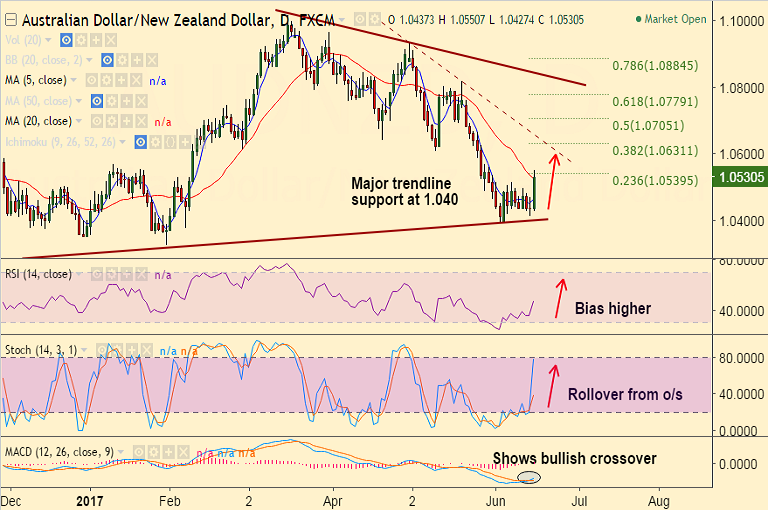 - AUD/NZD broke 20-DMA and hit 2-week highs at 1.0550 after Aussie was buoyed by stellar jobs data.