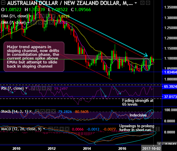 On the flips side, the major trend has been sliding back in the sloping channel (refer monthly charts), the current prices spike above EMAs but attempt to slide back in the sloping channel.