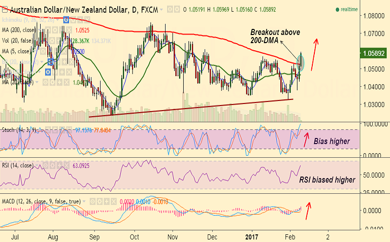 - AUD/NZD spikes above 200-DMA at 1.0525, intraday bias higher.