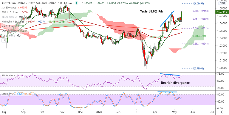 AUD/NZD spiked over 1% to hit 6-month highs at 1.0768 before paring some gains to trade at 1.0754, up 1.01% at 04:20 GMT.