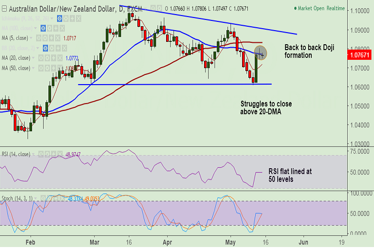 - AUD/NZD is seen struggling to extend gains above 20-DMA currently at 1.0772.