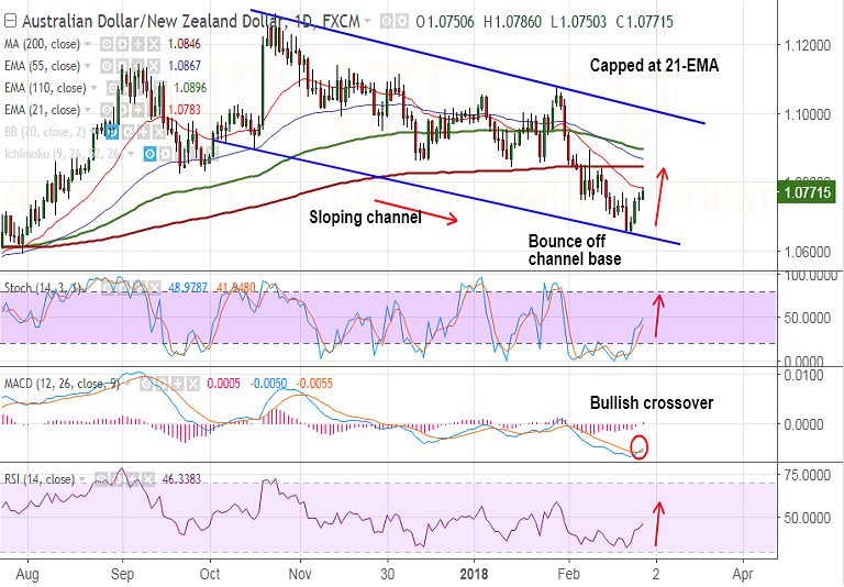 - AUD/NZD is trading in a slopping channel pattern and price action has bounced off channel base support in last week's trade.